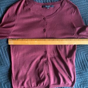 This thin burgundy cardigan features a round collar and long sleeves. It fastens at the front with small burgundy buttons.
