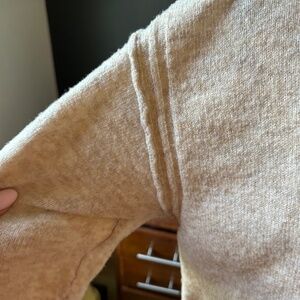 This cute tan sweater has a cherry pattern on the front. See photo of exposed seams which add an extra cute detail. This is a size XS but I usually wear a small and it fits me. From a pet free smoke free home.