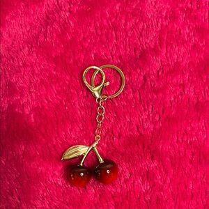 Charming cherry keychain with gold accents. Perfect for adding a playful touch to your keys.