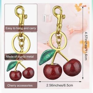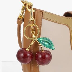 Sparkling red cherry keychain with gold hardware and a green leaf accent.