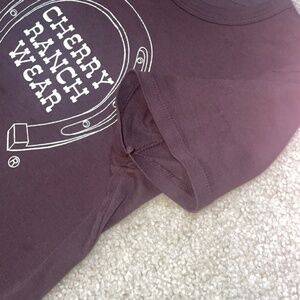 This baby tee is brown and in great worn condition. Size small/XS, Minor wear and tear like a tiny snag on one arm seam as shown in pics. When using flash there’s a couple spots that you can’t really see unless you take a pic using flash. Overall great condition:) questions and comments welcome! no returns. Thanks for looking!