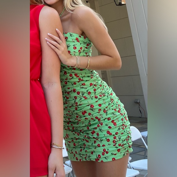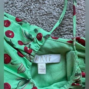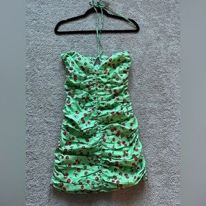 Cherry patterned mini dress. Ruching material. Key hole, tie-neck top. Brand: WAYF from Nordstrom. Worn once