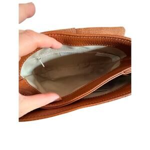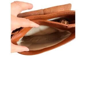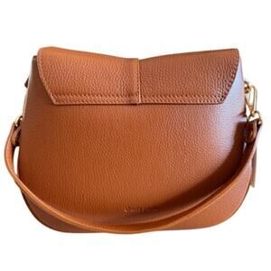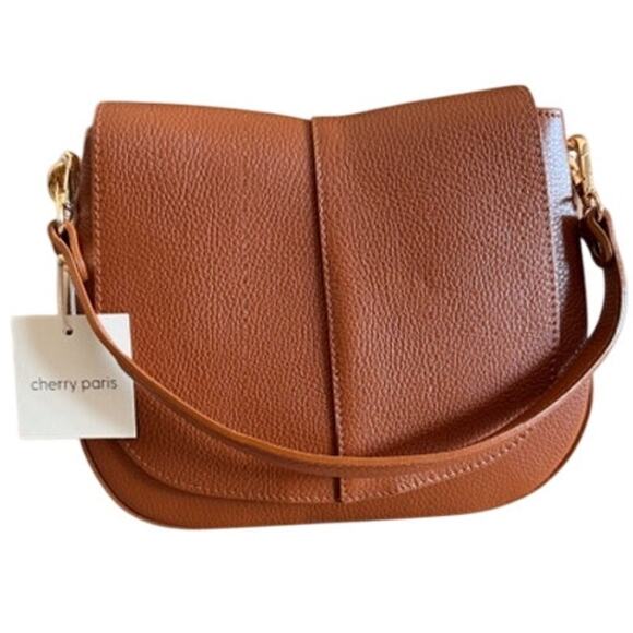 New with tags Cherry Paris Layana crossbody bag in cognac pebbled faux leather. Compact, structured silhouette with a top zip closure and flap-front detail. Features a detachable and adjustable crossbody strap, gold-tone hardware, and a fully lined interior with slip pocket. Lightweight, polished, and easy to wear for everyday or travel.