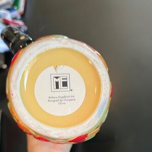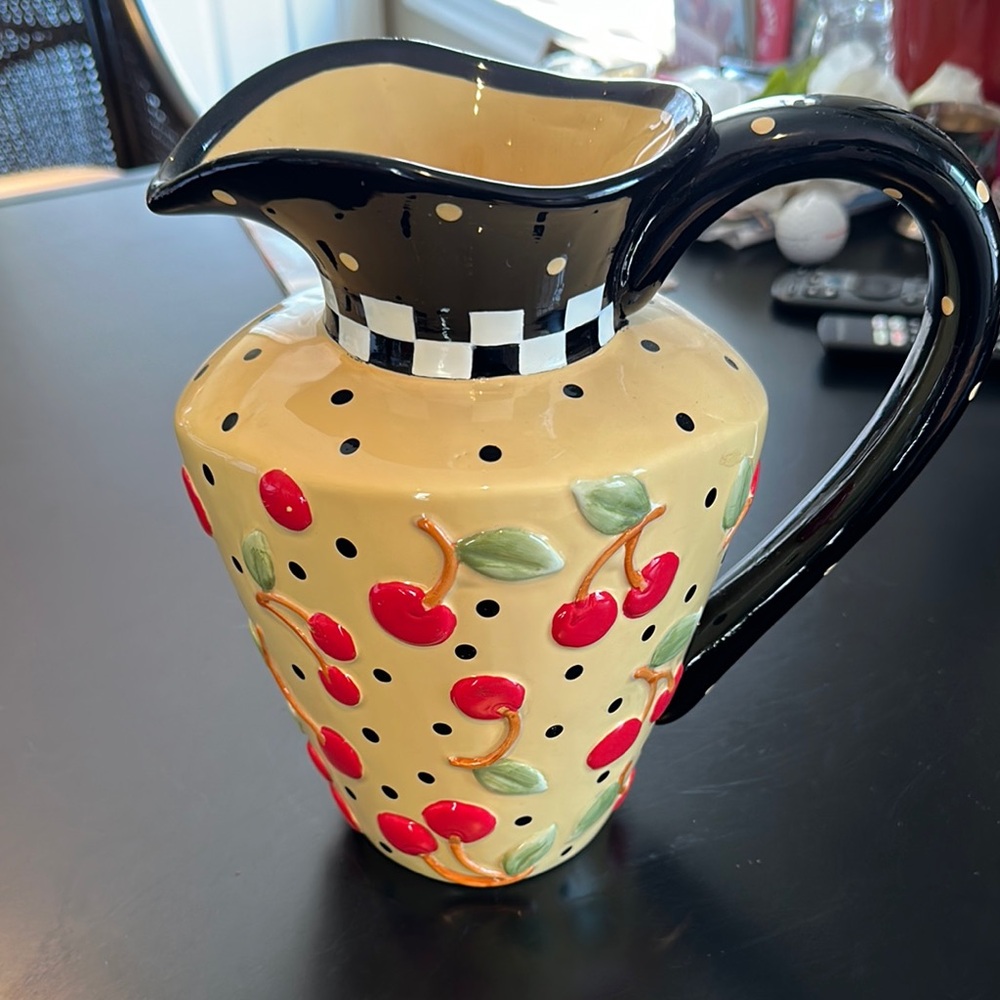 Charming ceramic pitcher with a cherry pattern. Features a black handle and checkered rim.