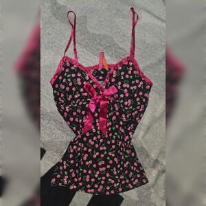 cherry print, babydoll silhouette, cami top, flirty style, soft girl, fairycore, y2k fashion, lounge wear, cute tank, vintage-inspired