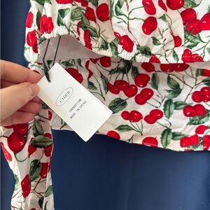 Charming crop top featuring a vibrant cherry print. Short puff sleeves and long ties add a playful touch. Size says 2xl but it’s small . I’d say a medium so maybe it’s Junior sizing