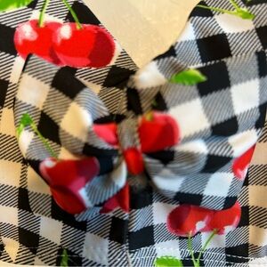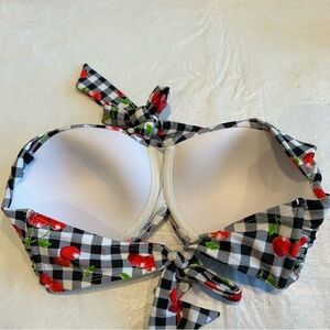 This stylish bikini top features a playful cherry print on a black and white checkered pattern. Perfect for a fun day at the beach.