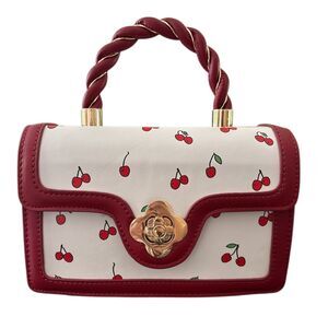 Add a pop of playful charm to your outfit with this adorable cherry print handbag! Featuring a bold red-and-white color palette, this bag combines classic style with a fun, youthful twist. The structured silhouette and gold-tone flower clasp give it a polished look, while the cherry pattern adds a touch of whimsy.