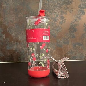 Clear tumbler with cherry print. Red base and lid. Includes straw. Stylish cherry clip. Both included in purchase! Never used.