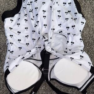 Stylish and fun, this cherry print one piece swimsuit is perfect for a day at the beach. The black and white design adds a classic touch.