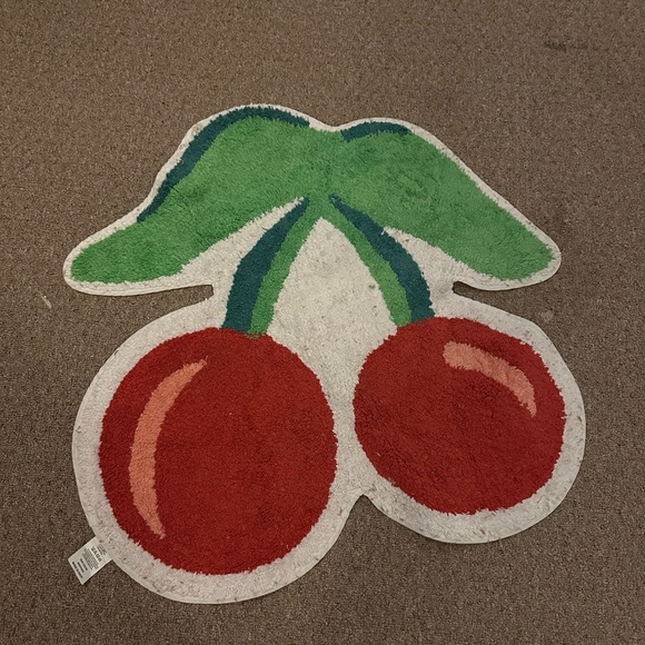 Playful cherry-shaped accent rug. Bright red cherries with green leaves. Fun statement piece for any room. Item is in fair gently used condition.