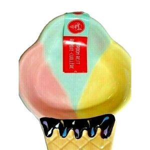 The Cherry Top Ice Cream Cone Spoon Rest Scooper Utensil Holder is an adorable multicolored ceramic addition to your kitchen counter, saving it from messy utensils and adding a touch of fun.