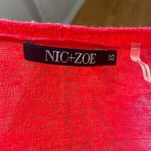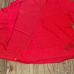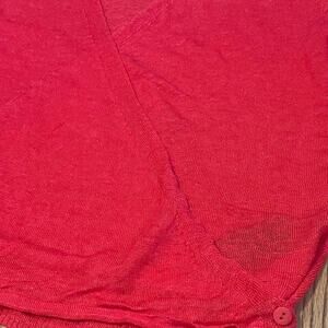 Cherry red Nic+Zoe wrap cardigan. Very lightweight fabric. Buttons on both hips to close the wrap. 3/4 length sleeve.