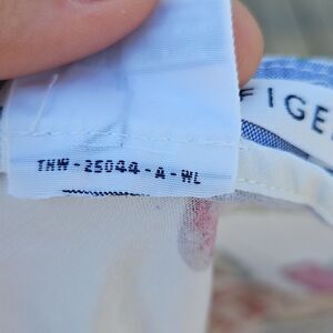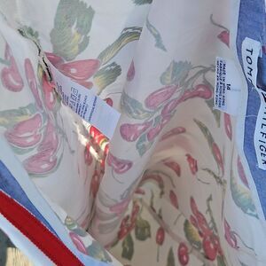 Fun and fresh vintage-inspired Tommy Hilfiger skirt featuring a vibrant red cherry print on a cream background. Made from 100% cotton for breathable comfort. Flattering A-line silhouette with a side zip closure. Finished with a red waistband trim for a pop of contrast. Made in Hong Kong, which often indicates an earlier Tommy Hilfiger piece with quality construction.