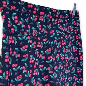Unknown brand cherry print slacks in perfect condition. Skinny fit, medium-high rise. Side hook and zipper closure. Belt loops and faux back pockets. Thick material, feels like most professional trousers. Runs a bit small for a size 4. Black background behind the cherries.