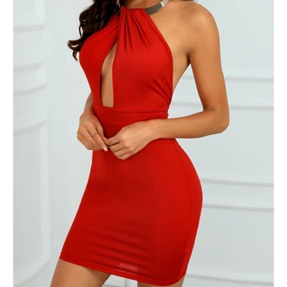 Cherry Red w/ Gold Bodycon Keyhole Cut Out Dress