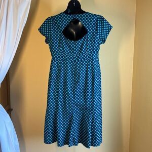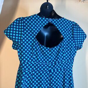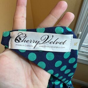 Make a statement in this stunning preloved Cherry Velvet XL Cotton Dress! This beautiful pin up retro style features a blue and turquoise polka dot print and back detail design, perfect for a chic yet casual look.