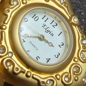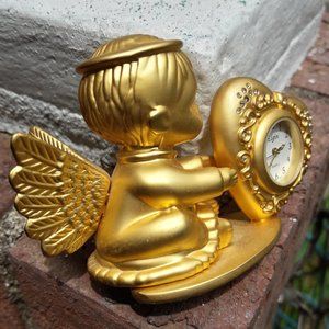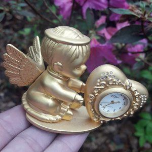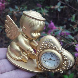 Cherub Clock Golden Mini Clock Cupid Angel by Elgin for table top or desk top Wonderful gift idea. Quartz clock is metal with heart shaped white face and tiny crystals in the heart. Havent tested it, probably needs a battery. Good condition no chips nor cracks. Measurement: 4 inches long x 2 1/4 inches tall x 2 inches deep. Clock face is 3/4 of an inch wide across.