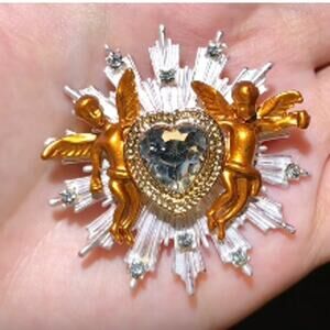 Cherubs and Heart Brooch Faux Jewel Starburst with Rhinestone Trim