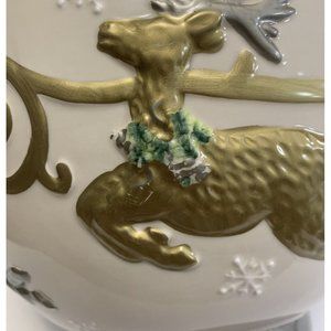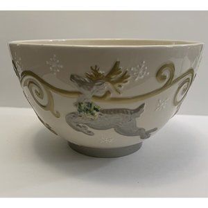 Cheryl & Company Christmas Holiday Serving Bowl Embossed 3D Gold Silver Reindeer Snowflakes. Hard to find. Some minor cosmetic wear to reindeer, see pictures for condition and measurements.