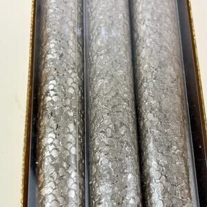 Platinum colored fragrance free 10" tapers with a confetti texture. Set of 6, burn time 8 hours.