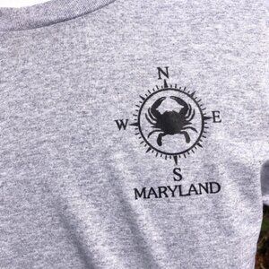 Show off your Maryland pride in this beautiful Chesapeake Bay Maryland Map Short Sleeve T-Shirt. Large Chesapeake Bay image on back of shirt featuring dogs, sailboats and crabber ship artwork. Small solid black compass rose on the front left chest. Constructed of a preshrunk 100% cotton, this tee stays feeling cool and classic day through night.