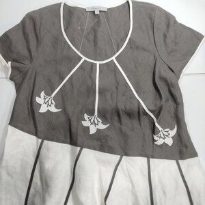 This is a Chesca linen maxi dress in gray and white with a floral pattern. It features a modest, artsy lagenlook style with short sleeves. The dress is perfect for making a statement with its unique artistic design.