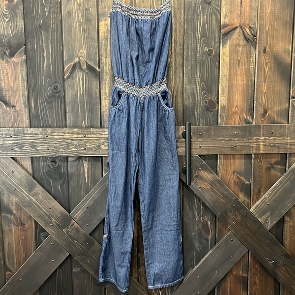 Chesley Denim Jumpsuit S Wide Leg Strapless Pockets Soft Elastic Stretch Waist