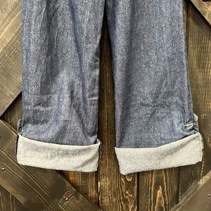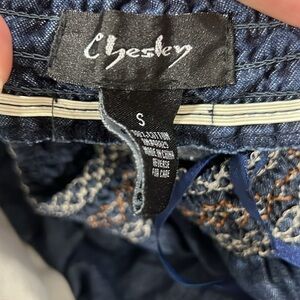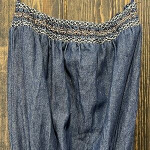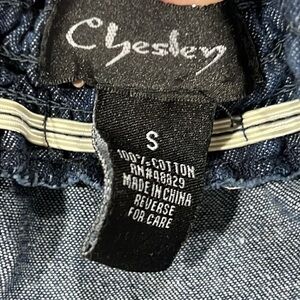 Chesley brand denim jumpsuit. Size small. Soft material. Stretch top & waist. Roll cuff tabs on hem for adjustable length. Wear full wide leg or cropped. Front & back pockets. Embroidery detail trim. Adorable! Preloved. Please see all photos for condition. All seasons. Dress up or down. Boho.