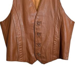 In great preowned condition with no rips, tears or holes noted! *there is some discoloring around the inside bottom of the vest as well as a tiny area at the tip front of the vest where the leather has worn