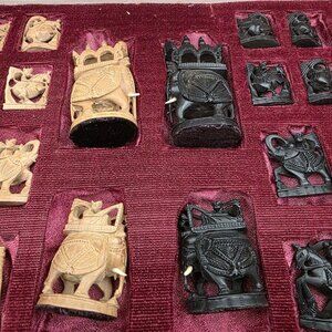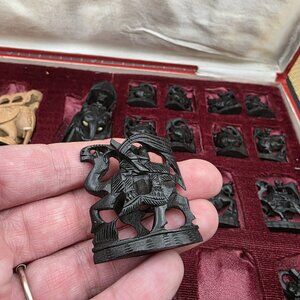 Chess Set Sandalwood Ebony Carved Wood Handmade Indian Mythology Sculpture VTG