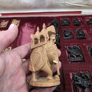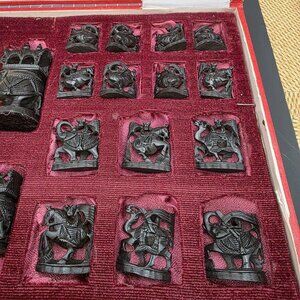 This intricately carved chess set is in very good condition. Please see photos showing condition of box. Careful and fast shipper. Thank you for looking!