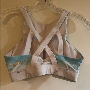 Chestee’s sports bra with a blue and white pattern. Kelsi Kiel design. Best used for weightlifting (cleans and jerks) movements.