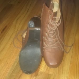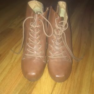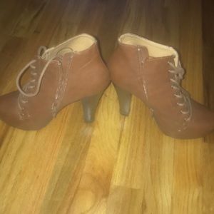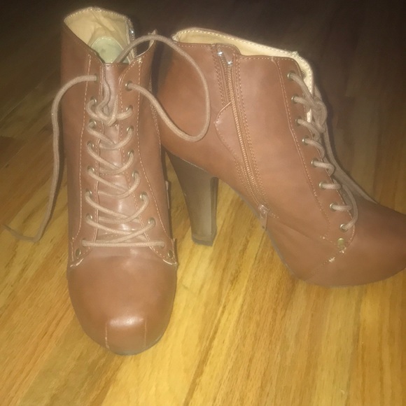 Ankle boots. Leather brown. Block heels. Laces. Zipper on inner side of boots. Very comfortable.