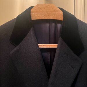 This item is in perfect pre-owned condition. The coat is center vented, single breast, with three buttons, and two outer pockets.