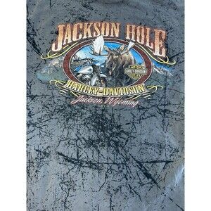 Women's Harley Davidson Jackson Hole Jackson, Wyoming graphic t-shirt, all over print, front and back graphic, size large. Measures 19x26. Runs small. No holes, stains, rips or tears. Pre-owned condition. Measurements in photos. Smoke free home.