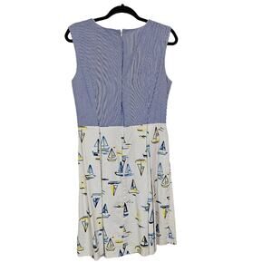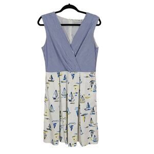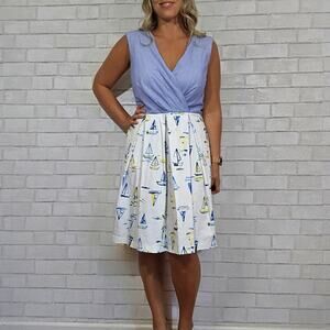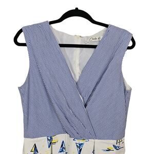 Adorable blue and white sailboat print flare dress from Chetta B. Size 12. Missing the yellow belt that goes with but otherwise excellent condition. Zipper down the back and pockets on the sides. Measures 38" long, bust is 18" and waist is 15.5"
