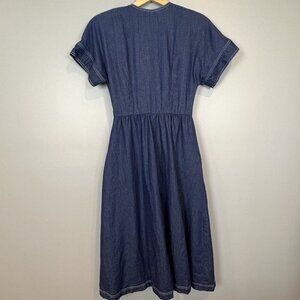Pre-owned in great condition. No defects. Dress snaps all the way down the front. Dress has pockets and shoulder pads. When flat dress measures 18" straight across bust (pit to pit), 14" across waist, 21" across hips and 50" in length.