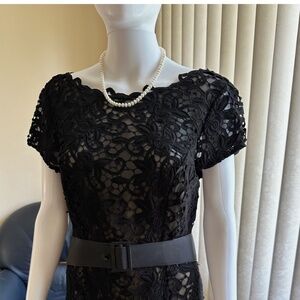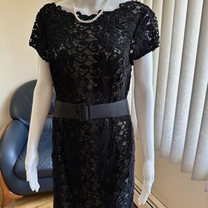 This stunning black lace cocktail dress from Chetta B Sherrie Bloom Peter Noviello with a beautiful belt is the perfect addition to any wardrobe.