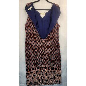 Chetta B Sleeveless Navy Orange Geometric Sheath Dress Gold Ring Detail Size 18