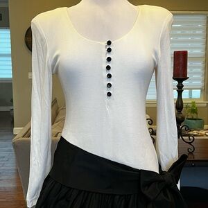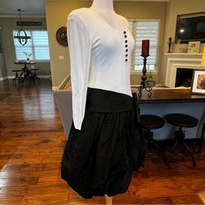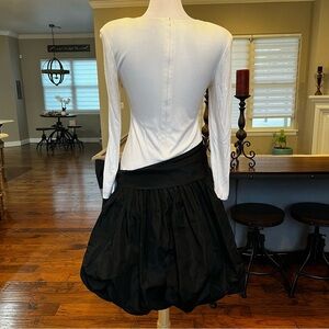 SOOOO cute....the top is an off white knit style, the skirt is black. It has a drop waist, a big giant bow that ties on the hip. The top is fitted and the skirt area is full which creates such a flattering look!!!