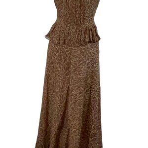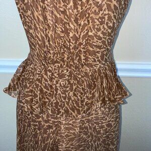 Very sophisticated brown silk dress with ruffled peplum and beaded round neck accent.