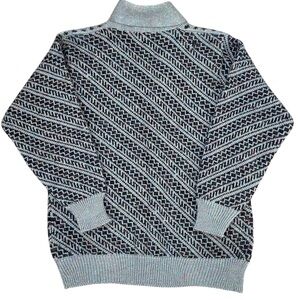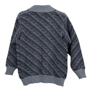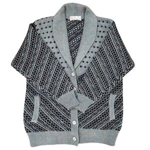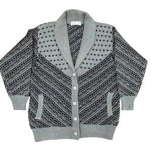 Stay warm and stylish with this vintage Cheung Kee 100% pure wool cardigan! This cozy, thick-knit sweater features an eye-catching gray and black geometric pattern, a shawl collar, and a button-up front for a timeless, retro look. It also has two front pockets, making it both functional and fashionable.
