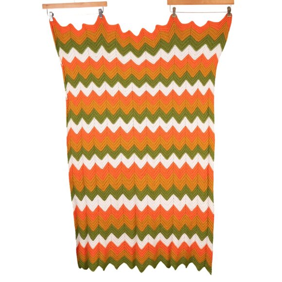 Chevron Afghan Throw Blanket VTG Orange Green Yellow Crochet Zigzag 70s 80s