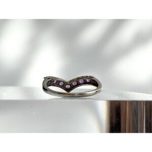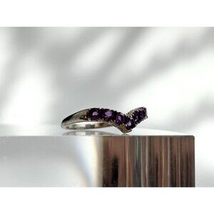 Silver toned chevron ring. Set along the top are round cut prong held amethyst gemstones. The prongs are shared. This ring can also be stackable with other gemstone rings. Lovely ring in wonderful condition.