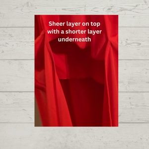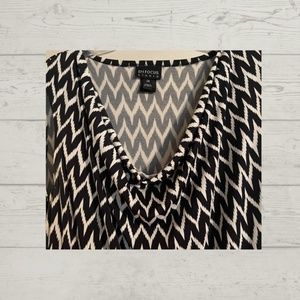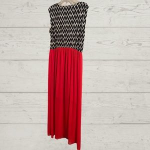 Enfocus brand dress, size 14. Has black and white chevron on top and burnt orange on bottom. Top of dress is a slinky material and bottom of dress is sheer with two slits and shorter layer underneath.