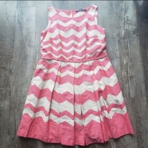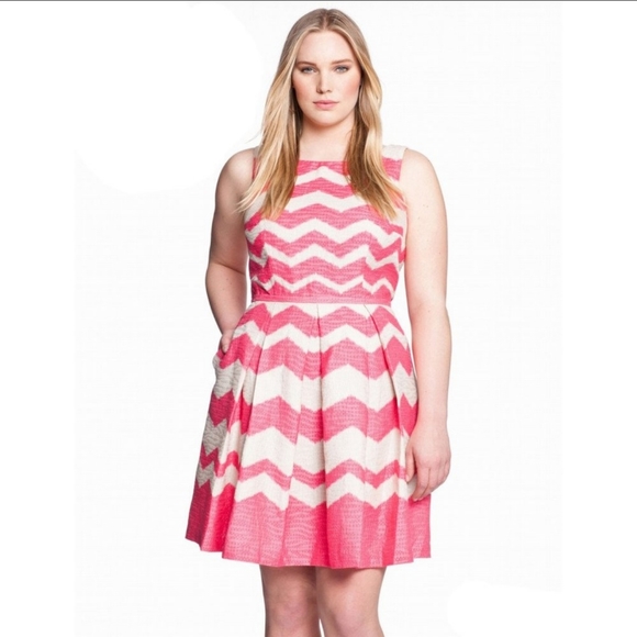 Features the sister to stripes: Chevron pattern in buttermilk and a tickle me pink colors! Pleats surrounds the dress which is a wonderful accent to the dress. Pockets on either side of the dress as well! 😍🤗 Try this piece with a solid color jacket, and you will rock the room!