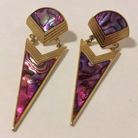 Chevron Earrings Pink Purple Mother Of Pearl Gold Tone Metal Pierced Post Dangle