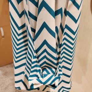 Cream with green chevron pattern, slit sleeve detail, back criss-cross back detail. Goes with everything.