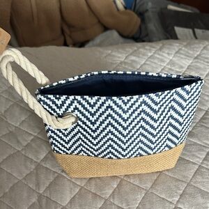 Mykonos multi color bag NWT. Stylish clutch featuring a navy and white chevron pattern woven fabric. Accented with a tan burlap base and a rope handle.